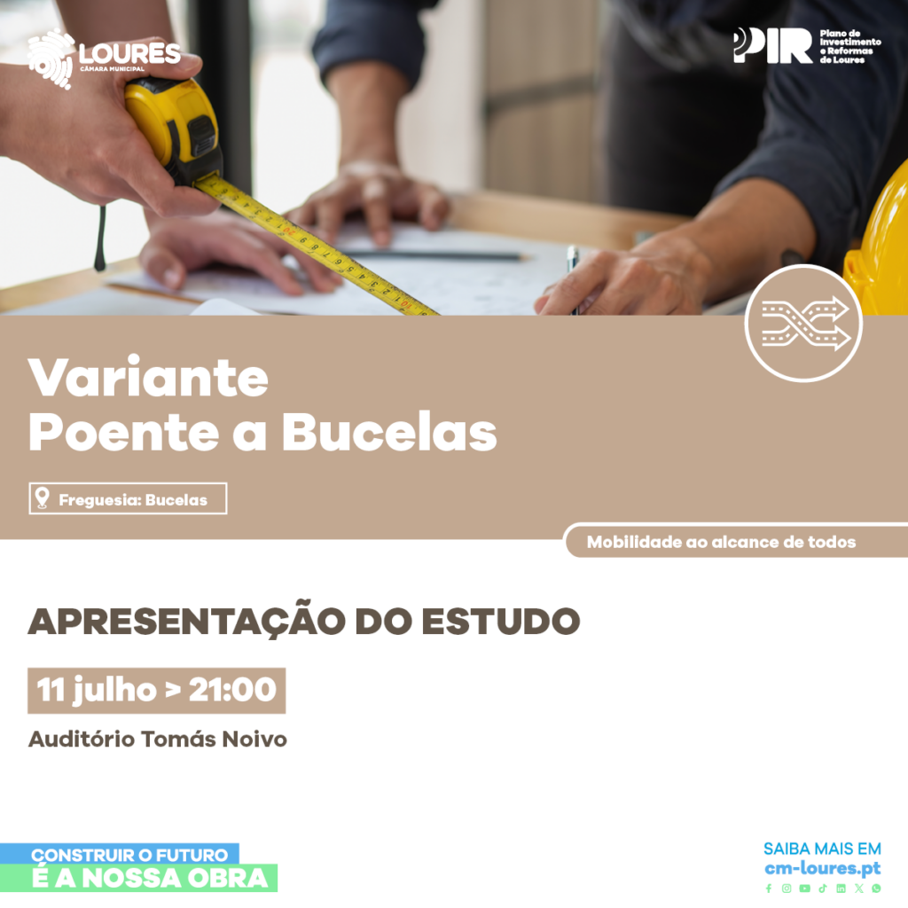 A Câmara Municipal de Loures convida a participar na apresentação do estudo da Variante Poente a Bucelas, que se realizará no dia 11 de julho, com início marcado para as 21 horas, no Auditório Tomás Noivo, em Bucelas.