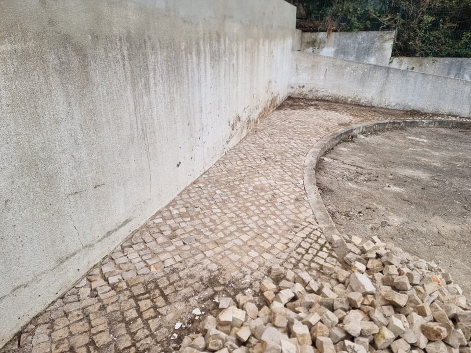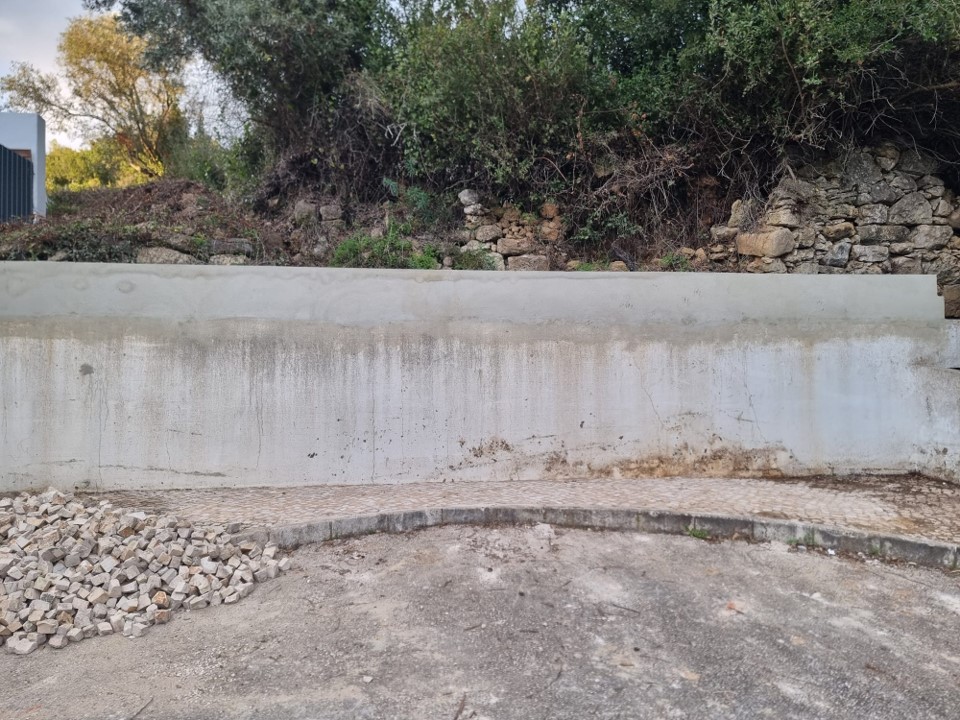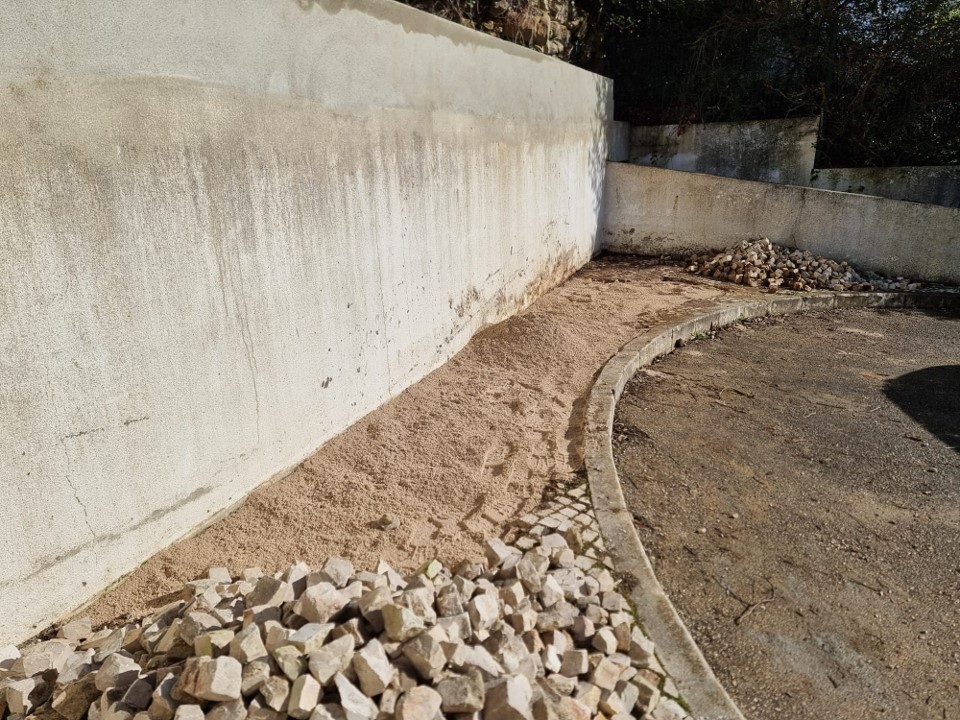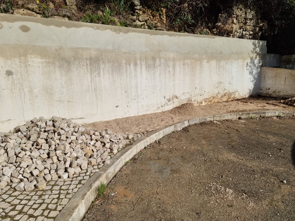 Na Rua Prof Maria Amor, entre Bucelas e Vila de Rei, para normalização do escoamento de águas pluviais, a Junta de Freguesia de Bucelas aumentou o muro de suporte de terras.