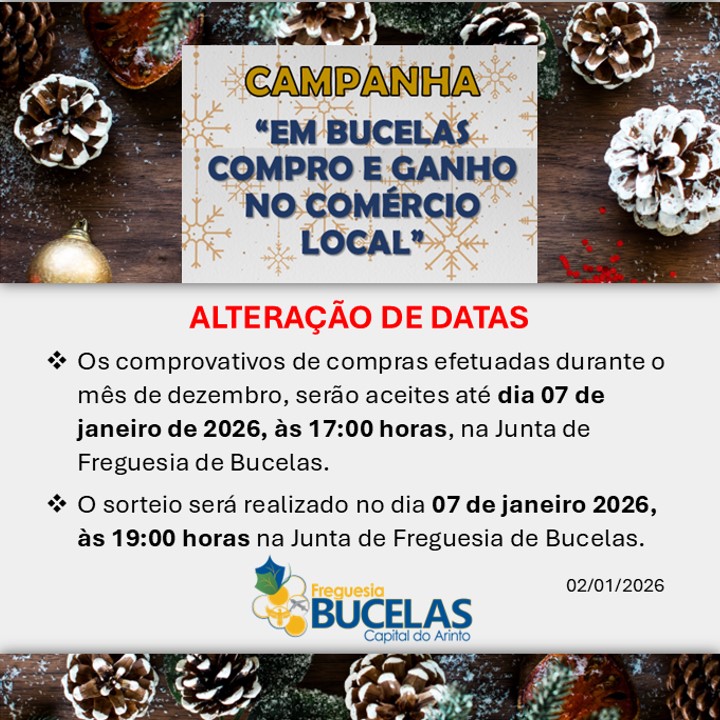 • Os comprovativos de compras efetuadas durante o mês de dezembro, serão aceites até dia 07 de janeiro de 2026, às 17:00 horas, para preenchimento dos cupões de participação, na Junta de Freguesia de Bucelas.