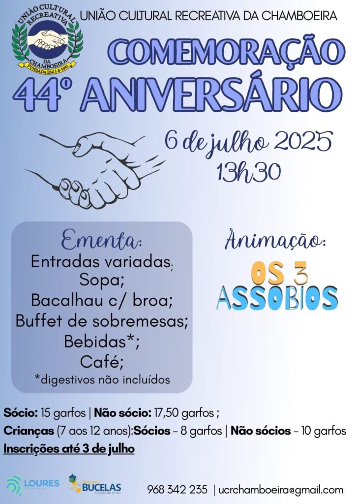44º aniversário da U.C.R. Chamboeira 26 Junho, 2025 44º aniversário da U.C.R. Chamboeira 13:30 6 Julho, 2025 Visualizar todo o calendário