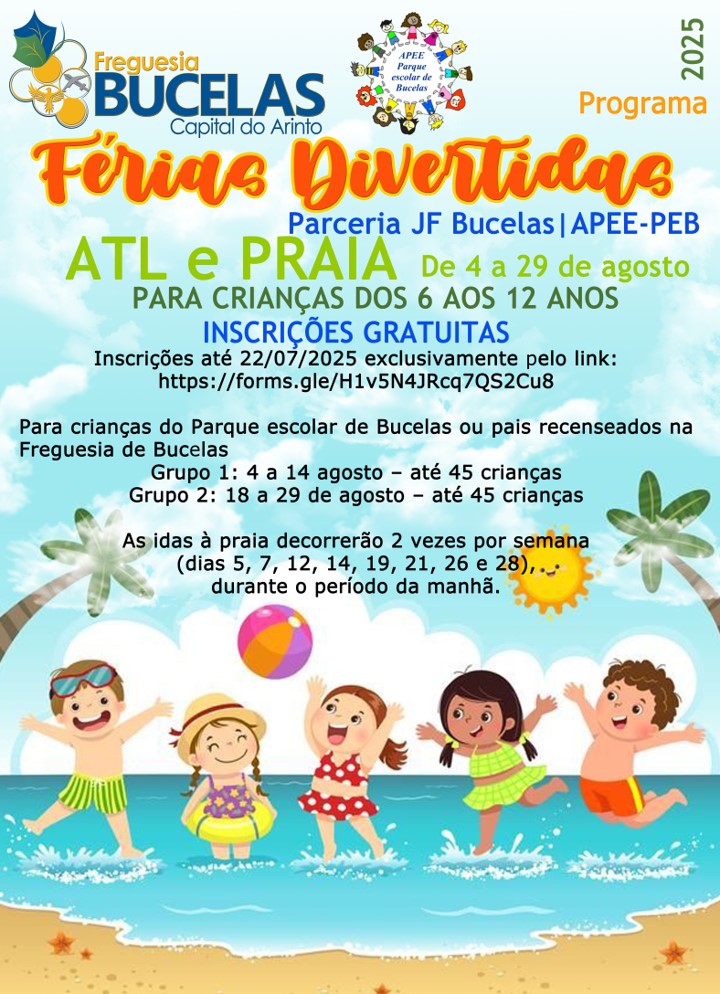 A atividade, sem custos para os participantes, consiste em ATL e Praia de 4 a 29 de agosto para crianças dos 6 aos 12 anos do Parque Escolar de Bucelas ou cujos pais sejam recenseados na freguesia de Bucelas.